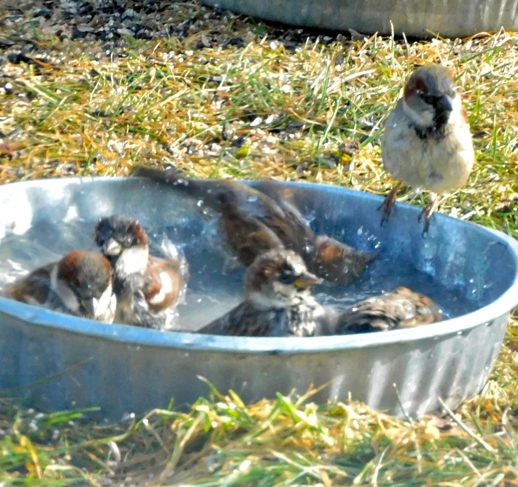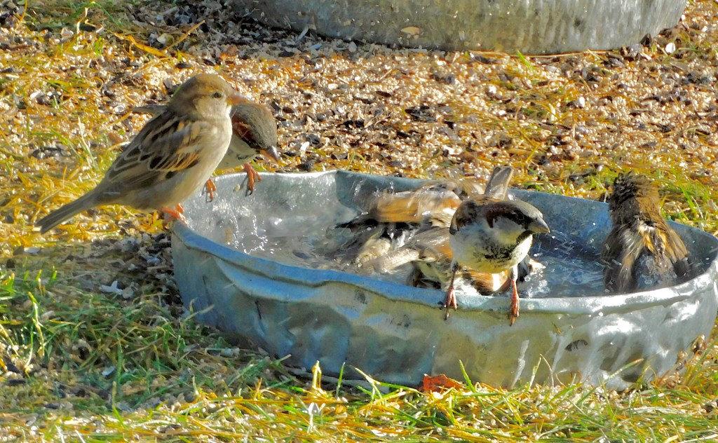What could be more simple than watching a few little brown birds disporting themselves in a bowl of water?