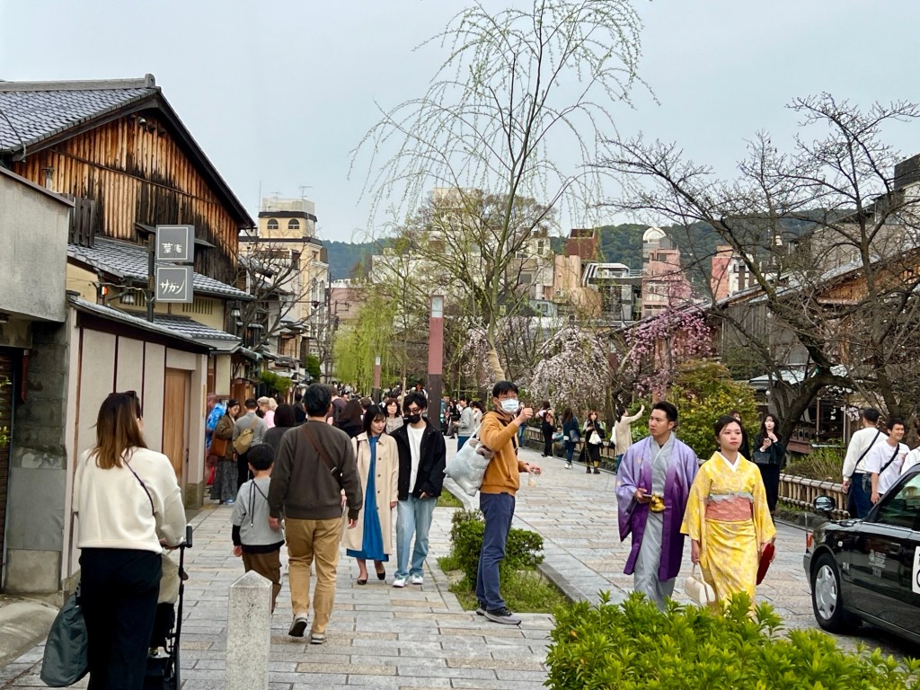 After a stop to see the impressive Nanzen-ji Buddhist Temple, where Zen monks train, we headed back on the subway towards the more centrally located Gion District. We saw the Yasaka Shrine from the outside and then wandered into Maruyama Park. The Park is a very popular local spot, and there were dozens of food vendors, pop-up restaurant seating, games, and more. The trees that were in bloom were crowded photo spots, with everyone vying for those perfect shots.