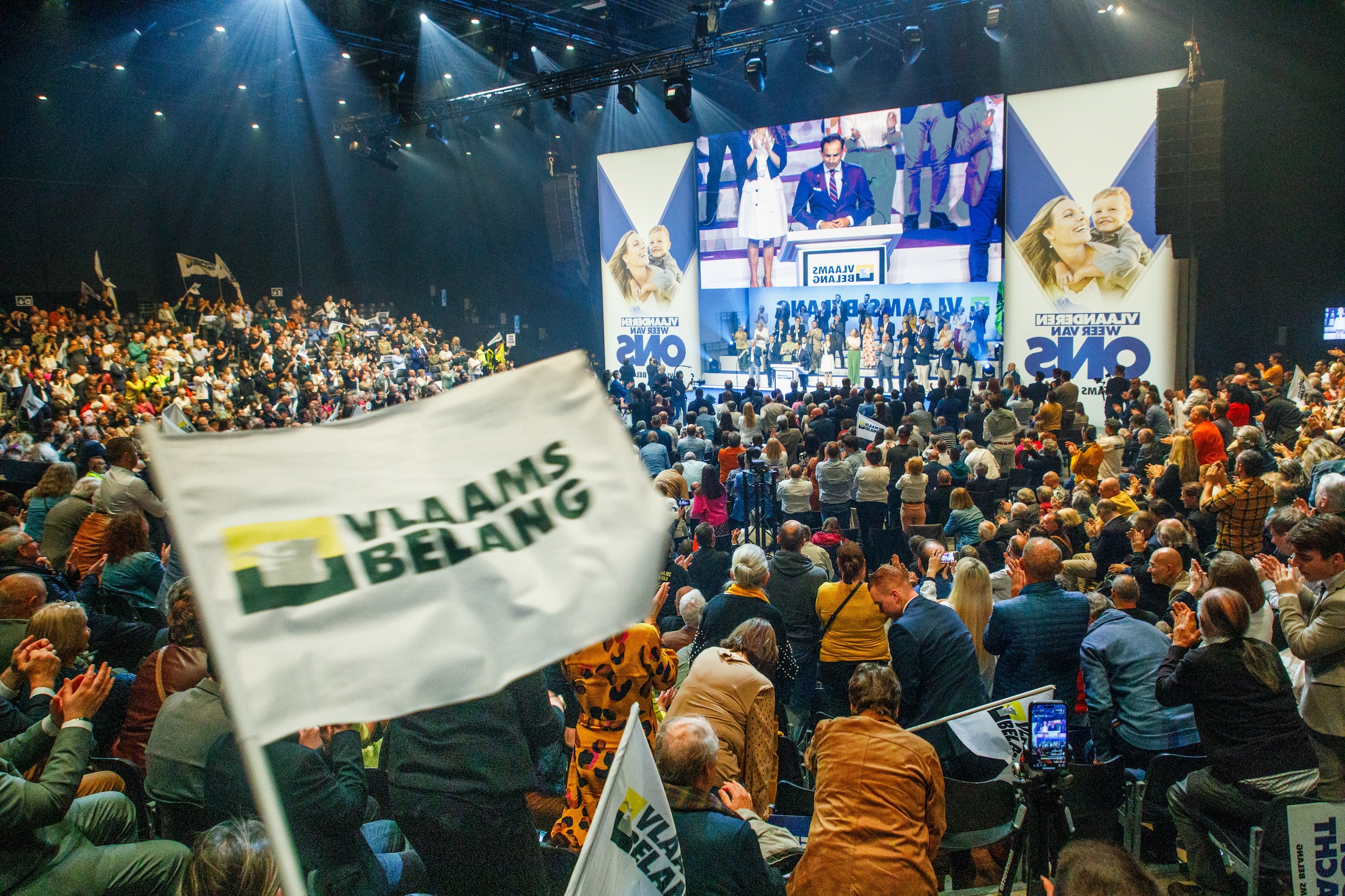 Een partijbijeenkomst van Vlaams Belang in Antwerpen, afgelopen zondag.Beeld Hatim Kaghat / Belga